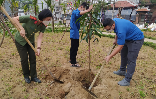 Đoàn viên Chi đoàn XDLL Công an TP Đà Nẵng và P. Phước Mỹ trồng cây tại Đình làng Phước Trường.