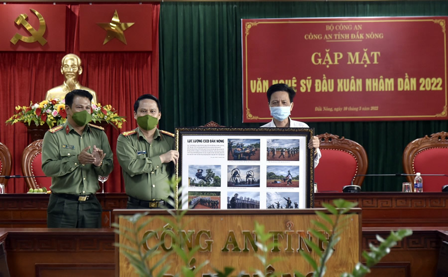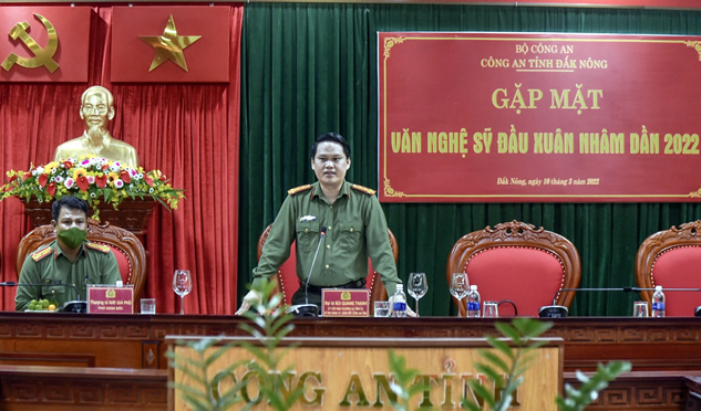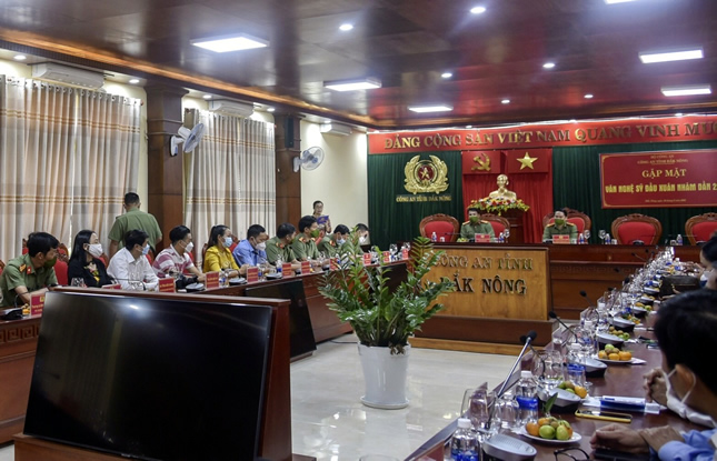 Ngày 10/3, Công an tỉnh Đắk Nông đã tổ chức gặp mặt đội ngũ văn, nghệ sỹ trên địa bàn tỉnh nhân dịp đầu xuân Nhâm Dần 2022. Đại tá Bùi Quang Thanh, Ủy viên Ban Thường vụ Tỉnh ủy, Bí thư Đảng ủy, Giám đốc Công an tỉnh chủ trì buổi gặp mặt. Tham dự buổi gặp mặt còn có Thượng tá Nay Gia Phú, Phó Bí thư Đảng ủy, Phó Giám đốc Công an tỉnh, lãnh đạo một số đơn vị nghiệp vụ Công an tỉnh; đại diện một số sở, ban, ngành cấp tỉnh và đôi ngũ văn, nghệ sỹ trong tỉnh.