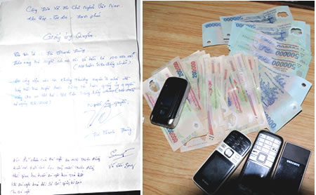 Theo khai nhận của nhóm này, năm 2008, trong quá trình kinh doanh, chồng bà N. (đã mất) nợ ông Hà Thanh H. 100 triệu đồng nên đầu tháng 6-2012, ông H. nhờ S. đòi nợ giúp, nếu được sẽ trả công 35%/tổng số tiền. Được S. đồng ý, ông H. viết giấy ủy quyền cho S. với nội dung: “Tôi tên H., hiện bà N. có nợ tôi số tiền 100 triệu đồng, nhưng do công việc nên tôi không lấy tiền bà N. được. Nay tôi làm giấy ủy quyền này cho em tôi là Võ Văn S. lấy giúp”. Viết xong giấy ủy quyền, ông H. bảo S. nhắn tin uy hiếp, đe dọa để bà N. sợ mà trả tiền. Quá sợ hãi, bà N. đành chấp nhận trả trước cho S. một số tiền để gia đình được yên. Đúng hẹn, sáng 15-6, S. gọi điện cho D., bảo đi đòi nợ cùng mình, nếu lấy được sẽ cho 1 triệu đồng. D. đồng ý và gọi thêm M. tham gia để tạo thêm “uy lực” và cũng nhằm kiếm ít tiền tiêu xài. Cả ba điều khiển 2 xe máy đến nhà bà N. để nhận tiền. Đến nơi S. đứng ngoài cảnh giới, còn D., M. vào để lấy tiền và ghi giấy biên nhận. Trong lúc D. và M. đang nhận tiền thì bị CA bắt quả tang...