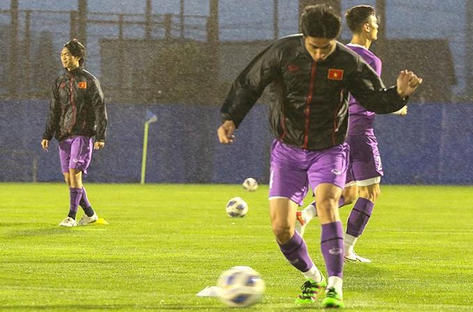 Tuy vậy, buổi tập của đội tuyển đã không được trọn vẹn như mong muốn. Sau nội dung khởi động, trời đổ mưa dày hạt kèm theo nhiệt độ hạ thấp và gió giật rất mạnh, khiến các cầu thủ gặp khá nhiều khó khăn trong việc kiểm soát trái bóng. Lo ngại sức khỏe các học trò có thể bị ảnh hưởng trong điều kiện thời tiết bất lợi như vậy, HLV Park Hang-seo quyết định nổi còi thu quân khi buổi tập mới trôi qua chưa đến 50 phút.