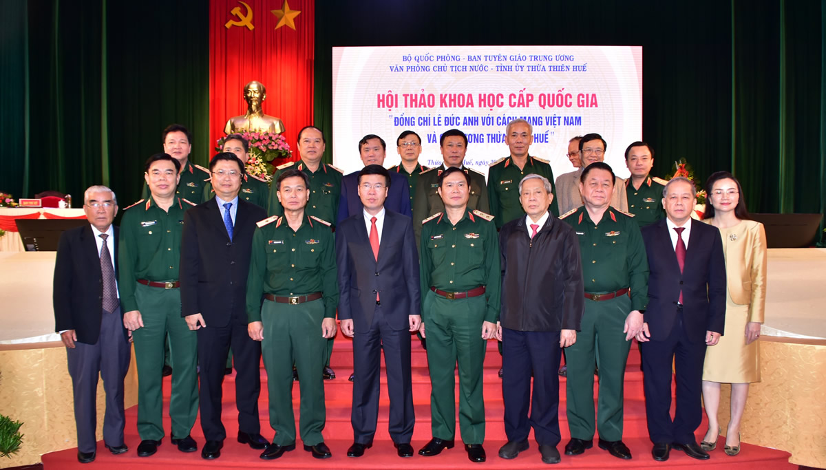 Đó là chủ đề của Hội thảo khoa học cấp quốc gia do Bộ Quốc phòng, Ban Tuyên giáo Trung ương (T.Ư), Văn phòng Chủ tịch nước và Tỉnh ủy TT- Huế long trọng tổ chức vào ngày 30-11 tại TP Huế (TT-Huế). Ủy viên Bộ Chính trị, Bí thư T.Ư Đảng, Trưởng Ban Tuyên giáo T.Ư Võ Văn Thưởng; UVT.Ư Đảng, Ủy viên Quân ủy T.Ư, Thứ trưởng Bộ Quốc phòng, Trung tướng Nguyễn Tân Cương; UVT.Ư Đảng, Bí thư Tỉnh ủy, Chủ tịch HĐND tỉnh TT-Huế Lê Trường Lưu tham dự, chủ trì hội thảo. Dự hội thảo có đại diện Văn phòng Chủ tịch nước, lãnh đạo Tỉnh ủy, UBND tỉnh TT-Huế, các đồng chí cán bộ lão thành cách mạng, các nhà khoa học, các tướng lĩnh, sĩ quan và đại diện gia đình Chủ tịch nước- Đại tướng Lê Đức Anh.