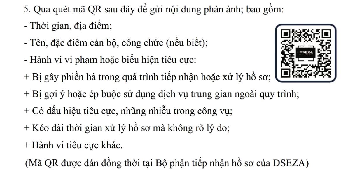 Các cá nhân, tổ chức, đơn vị, doanh nghiệp phản ánh còn có thể quét mã QR để gửi nội dung phản ánh sự việc, vấn đề với các thông tin về thời gian, địa điểm; tên, đặc điểm cán bộ, công chức (nếu biết); hành vi vi phạm hoặc biểu hiện tiêu cực: bị gây phiền hà trong quá trình tiếp nhận hoặc xử lý hồ sơ; bị gợi ý hoặc ép buộc sử dụng dịch vụ trung gian ngoài quy trình; có dấu hiệu tiêu cực, nhũng nhiễu trong công vụ; kéo dài thời gian xử lý hồ sơ mà không rõ lý do; hành vi tiêu cực khác.