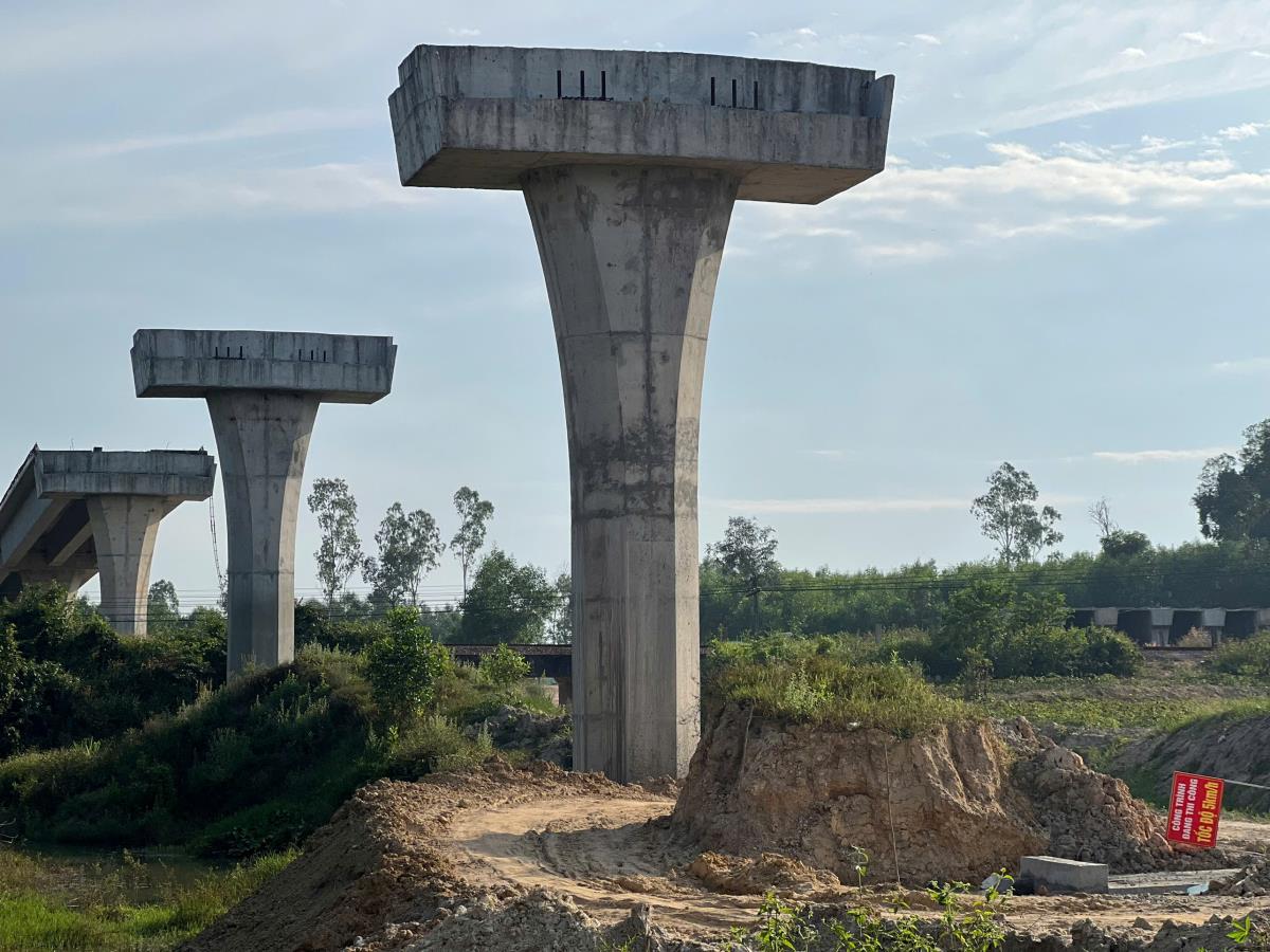 Cách đó không xa, hạng mục cầu vượt đường sắt thuộc Km4+908,14 nằm trong dự án này cũng dừng thi công lâu nay. Công trình cầu vượt đường sắt gồm 5 nhịp giản đơn với tổng chiều dài 211,5m. Mặt cắt ngang rộng 7,5m, gồm 3 phiến dầm Super T đặt cách nhau 2,4m, thi công lắp ghép. Ghi nhận tại hiện trường cho thấy, chỉ 2 bản mặt cầu nhịp 4 và 5 đã hoàn thiện; các trụ cầu còn lại vẫn nằm trơ khung, đang chờ tiếp tục triển khai, thi công.