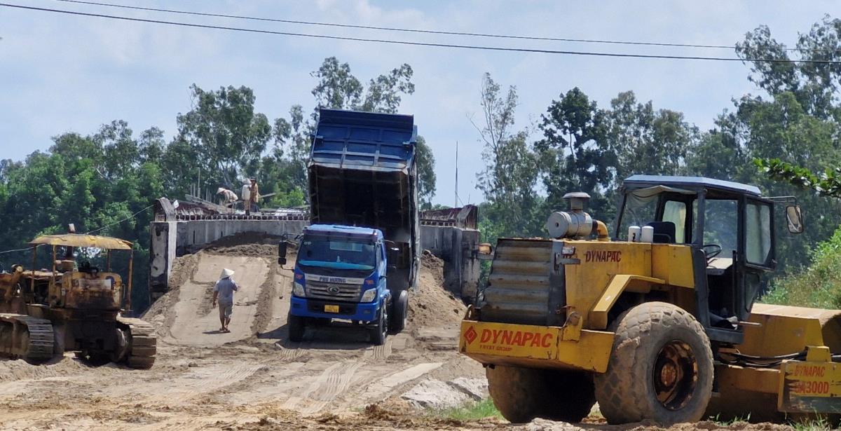 Nhằm có nguồn nguyên liệu đắp cho mố cầu và đường dẫn phía Bắc, đơn vị thi công là Công ty Phú Hương đã múc nguồn cát ở dưới sông, bên dưới các trụ cầu để vận chuyển lên đắp đường dẫn. Theo người dân địa phương cho biết, trước đây đơn vị thi công nhiều lần muốn lấy nguồn cát dưới sông để chở lên đắp đường dẫn đầu cầu, nhưng người dân không cho. Đến nay, sau khi địa phương và chủ đầu tư xuống làm việc lại với người dân, thì họ mới đồng ý.