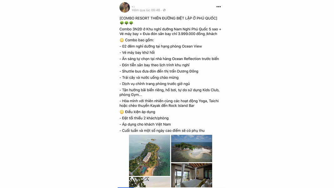 Ngày 22-7, chị Nguyễn Thị A., trú P.Hòa Minh (Q.Liên Chiểu, TP Đà Nẵng) đã gửi đơn đến cơ quan Công an tố cáo tài khoản facebook N.N có hành vi lừa đảo chiếm đoạt tiền của chị. Trước đó, thấy trên facebook N.N rao bán trọn gói chuyến du lịch 3 ngày 2 đêm Đà Nẵng - Hà Nội - Hạ Long (ở khách sạn 5 sao, đi du thuyền tham quan vịnh Hạ Long...) giá chỉ 5.850.000đồng/người nên chị A. đã đặt tour cho 2 vợ chồng. Tuy nhiên, sau khi nhận đủ tiền của chị A., đến nay, chủ facebook N.N đã lặn mất tăm, gọi không nghe máy, chặn luôn facebook. Chị A. cho biết thêm không chỉ có mình chị nhiều người bà con và bạn bè của chị cũng đặt tour giá rẻ từ facebook này và đã trao tiền nhưng đến nay chủ facebook này đã "lặn" không sủi tăm.