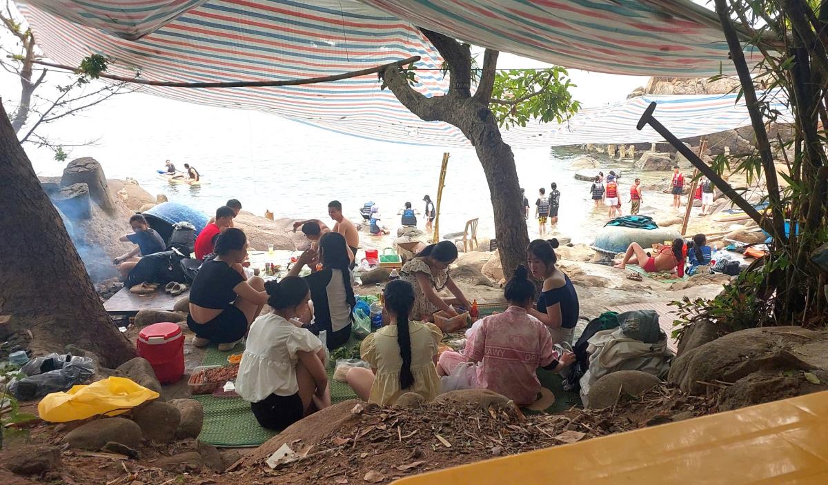 Quan sát thực tế, chỉ trong khoảng từ 8 đến 10 giờ ngày 27-4, chúng tôi ghi nhận mỗi điểm này đón hàng trăm khách, gồm cả khách đoàn và khách lẻ. Chọn điểm dừng chân, chúng tôi được một người đàn ông giới thiệu về các hoạt động được phục vụ tại đây như các món ăn nhậu tươi ngon, dịch vụ dưới nước. “Em cứ đưa khách đến đây trải nghiệm, đảm bảo sẽ hài lòng. Giá thuê sạp dao động 300 đến 500 nghìn đồng tùy số người. Nếu bọn em đưa đồ lên thì ở đây có phục vụ bếp than, còn nếu không thì bên anh phục vụ”, người này nói và cho biết tại đây còn có các dịch vụ dưới nước như mô-tô nước, kéo phao chuối, chèo sup, lặn biển chụp ảnh, ngắm san hô, bắn cá...