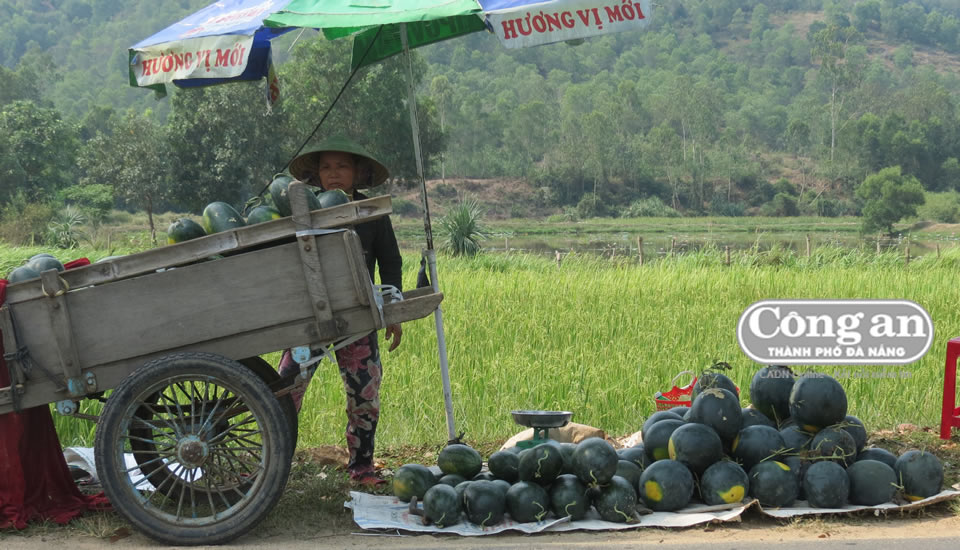 Thương lái không đến, nông dân xứ Quảng chỉ còn cách đem dưa đi bán lẻ. |