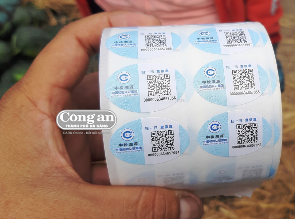 Tem nhãn được thương lái liên kết với phía Trung Quốc làm dán lên trái dưa Phú Ninh. |