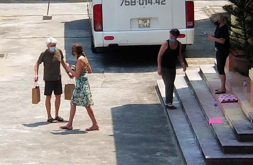 Khách nước ngoài bên trong khu cách ly nhận phần cơm miễn phí do cơ quan chức năng mang đến. |