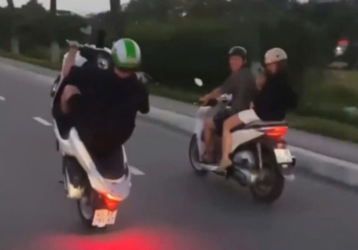 Hình ảnh người nước ngoài chạy xe máy bốc đầu trên đường.