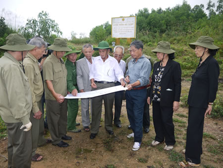 Ông Trần Ngọc Ảnh (áo trắng, mũ tai bèo) và đồng đội về thăm lại Núi Thành. |
