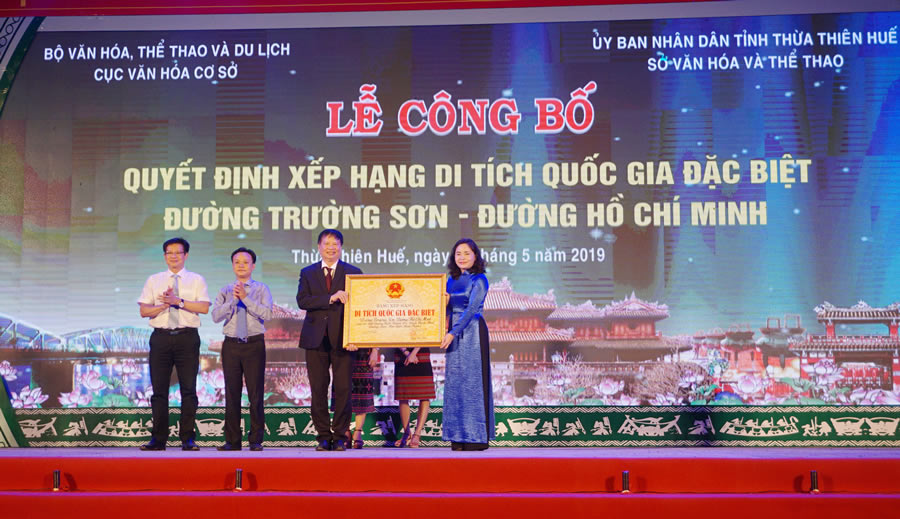 TT-Huế- Tối 15-5, tại quảng trường H. A Lưới (TT- Huế), Thừa ủy quyền của Thủ tướng Chính phủ, Thứ trưởng Bộ VH-TT&DL Trịnh Thị Thủy đã công bố và trao Bằng xếp hạng Di tích Quốc gia đặc biệt Đường Trường Sơn- Đường Hồ Chí Minh cho tỉnh TT-Huế.