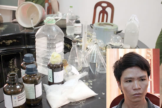 Hồ Viết Thông và các dụng cụ điều chế ma túy đá. |