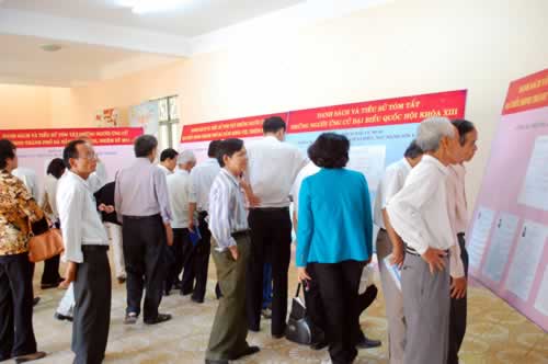Cử tri nghiên cứu tiểu sử ƯCV ĐBQH khóa XIII trước giờ tiếp xúc. |