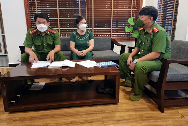 Thiếu tá Phan Xuân Phúc - Phó trưởng CAP Hòa Thọ Đông thăm hỏi Bí thư chi bộ khu dân cư nắm bắt tình hình thực tế.