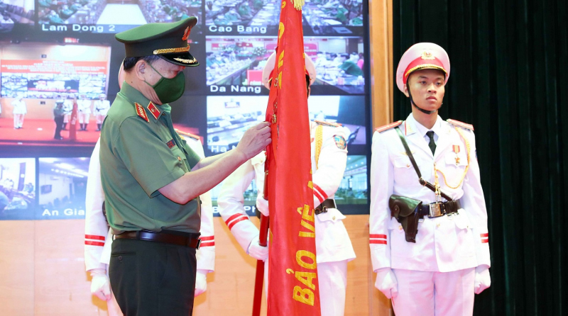 Thừa ủy quyền của Chủ tịch nước, Bộ trưởng Tô Lâm gắn Huân chương Quân công hạng Nhì lên Cờ truyền thống của Cục Cảnh sát PCCC và CNCH. |