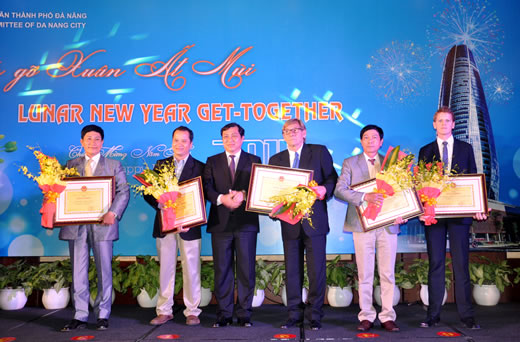 | Chủ tịch UBND TP Huỳnh Đức Thơ tặng bằng khen cho tổ chức, cá nhân người nước ngoài có nhiều đóng góp cho TP Đà Nẵng. |