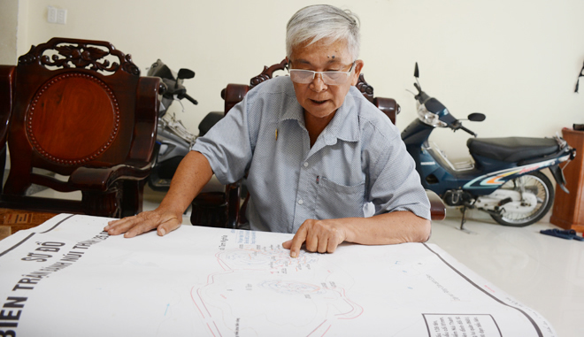 Ông Trần Ngọc Ảnh kể lại trận đánh Núi Thành trên sơ đồ. |