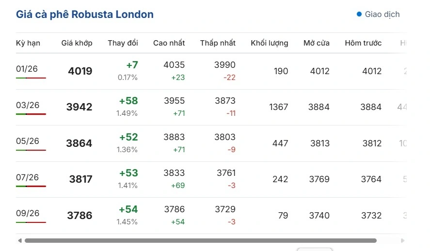 Giá cà phê trên thị trường thế giới tối 30/12 (theo giờ Việt Nam) tiếp tục tăng trên cả 2 sàn giao dịch quốc tế. Giá cà phê Robusta hợp đồng kỳ hạn giao tháng 1/2026 trên sàn London tăng 0,17%, tương ứng tăng 7 USD/tấn, niêm yết ở mức 4.019 USD/tấn.