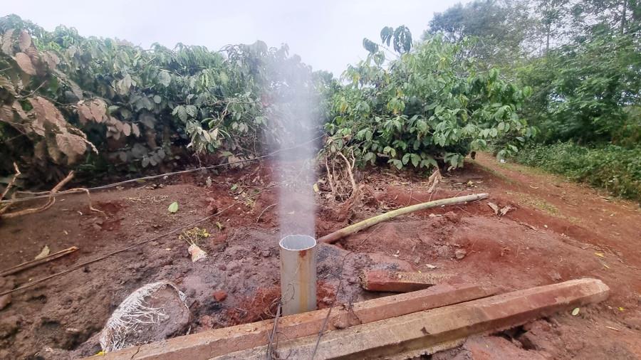 Theo đó, cuối tuần vừa rồi, ông Bùi Văn Tự (thôn Hưng Tiến, xã Ia Phìn, huyện Chư Prông, tỉnh Gia Lai) thuê người khoan giếng tại rẫy cà-phê của gia đình để lấy nước tưới và sinh hoạt. Khi khoan đến độ sâu 90 m thì bất ngờ nước từ dưới phun trào lên, kèm theo bọt khí. Sau đó, gia đình ông Tự đã cố lấy cọc bê-tông để bịt miệng giếng lại. Tuy nhiên, do áp lực quá mạnh nên cọc nặng cả tạ cũng bị đẩy ngược lên trên.
