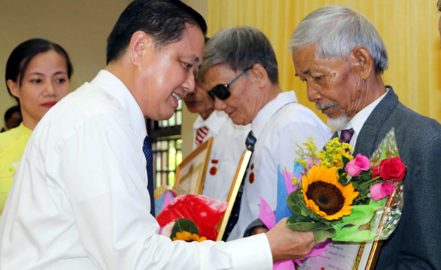 | Già làng Nguyễn Văn Cần nhận Huy hiệu 45 năm tuổi Đảng. |