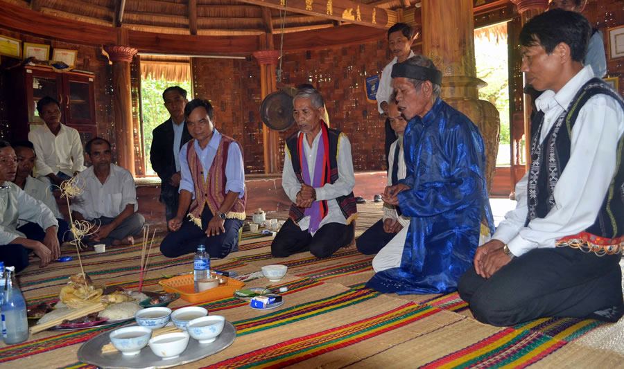 | Già Cần (thứ 3 từ phải sang) cùng cộng đồng người Cơ Tu gìn giữ bản sắc văn hóa truyền thống. |
