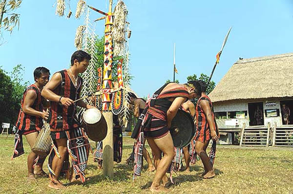 Các nghệ nhân Cơ Tu Tây Giang biểu diễn trống, chiêng Cơ Tu nhân ngày mừng Gươl mới tại Làng văn hóa, Du lịch các dân tộc Việt Nam, Đồng Mô Sơn Tây, Hà Nội. Ảnh: Pơloong Plênh |