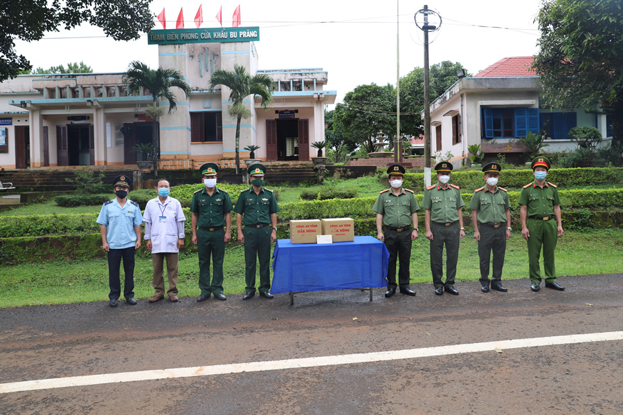 Trao tặng quà cho cho các lực lượng thực hiện nhiệm vụ bảo đảm ANTT và phòng, chống dịch tại Cửa khẩu Bu Prăng, huyện Tuy Đức. |
