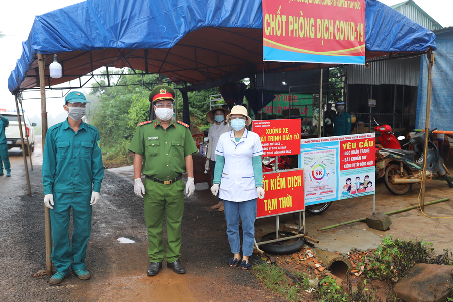 Các lực lượng tuyến đầu phòng, chống dịch trên địa bàn huyện Tuy Đức căng mình bảo đảm ANTT và phòng, chống dịch Covid-19. |