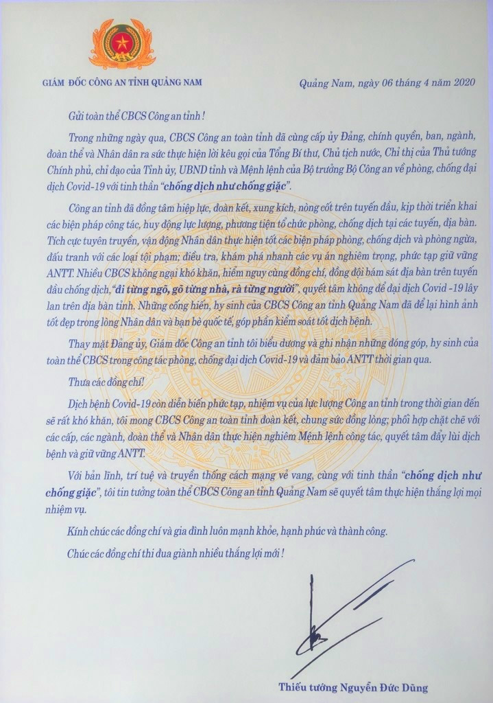 Thư của Thiếu tướng Nguyễn Đức Dũng - Giám đốc Công an tỉnh Quảng Nam gửi CBCS Công an tỉnh. |