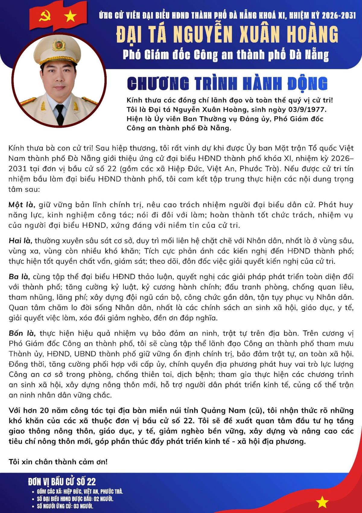 Đại tá Nguyễn Xuân Hoàng ứng cử tại Đơn vị bầu cử số 22, bao gồm 03 xã: Hiệp Đức, Việt An, Phước Trà (TP Đà Nẵng).