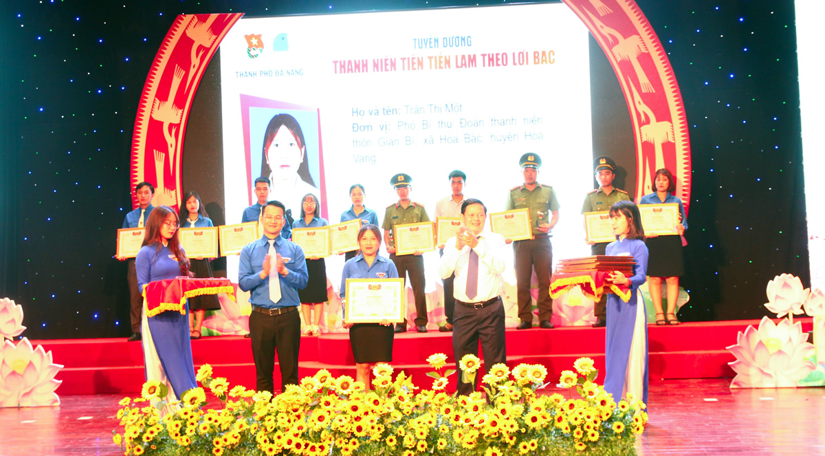 Chị Trần Thị Một (giữ, hàng đầu) được vinh danh "Thanh niên tiên tiến làm theo lời Bác". |