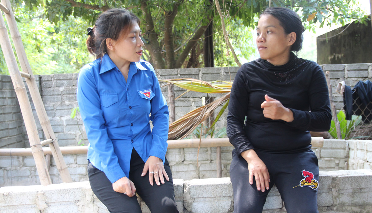 Chị Trần Thị Một (trái) vận động phụ nữ Cơ Tu giữ gìn và phát triển nghề dệt thổ cẩm. |