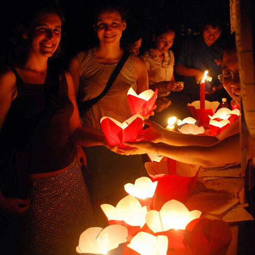 Du khách mua hoa đăng ủng hộ học sinh nghèo. |