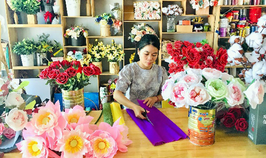 Chị Trinh miệt mài sáng tạo với công việc làm hoa giấy. |