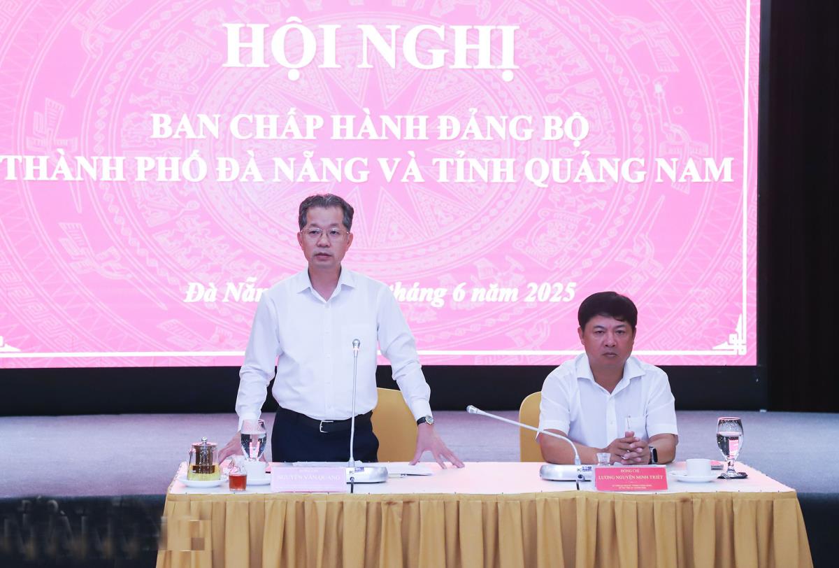 Ủy viên Trung ương Đảng, Bí thư Thành ủy, Trưởng đoàn đại biểu Quốc hội thành phố Đà Nẵng Nguyễn Văn Quảng và Ủy viên dự khuyết Trung ương Đảng, Bí thư Tỉnh ủy Quảng Nam Lương Nguyễn Minh Triết đồng chủ trì hội nghị.