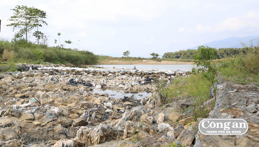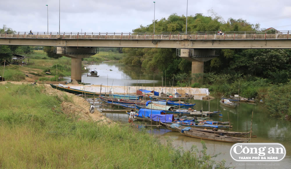 Đập tạm tại Quảng Huế để ngăn nước về sông Vu Gia, chảy xuống Đà Nẵng nhưng nước không thể đến chân đập. |