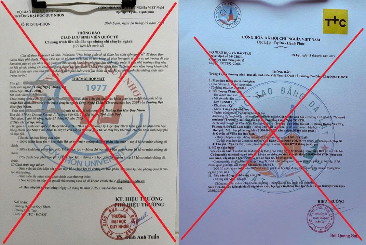 Từ trung tuần tháng 3-2025 đến nay, nhiều trường đại học, cao đẳng tại các tỉnh miền Trung - Tây Nguyên bị mạo danh tuyển sinh du học, giao lưu quốc tế để lừa đảo chiếm đoạt tài sản. Theo đó, trên mạng xã hội xuất hiện một số văn bản giả mạo Trường Đại học Quy Nhơn, Trường Đại học Phú Yên, Trường Cao đẳng Đà Lạt liên kết đào tạo với các trường đại học ở Hàn Quốc, Nhật Bản, Úc… nhằm lừa đảo, chiếm đoạt tài sản của sinh viên.