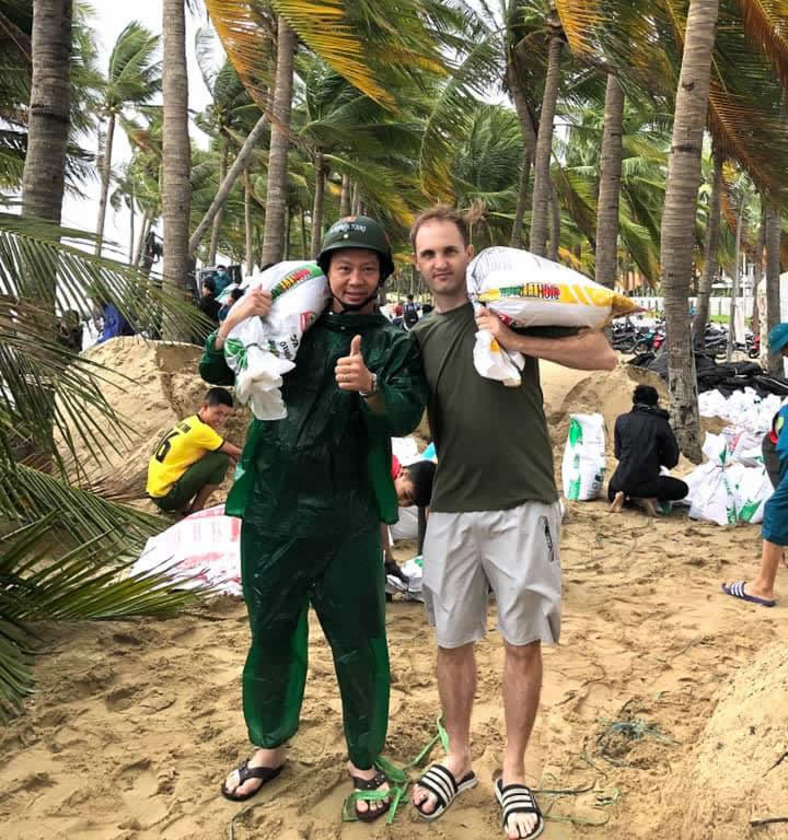 Điều đáng nói, ngoài lực lượng chức năng cùng người dân địa phương tham gia còn có một số du khách nước ngoài cũng chung tay góp sức. Có mặt tại buổi gia cố bờ kè, anh Trần Anh Khoa- giám đốc một doanh nghiệp du lịch ở Hội An cho hay: “Sáng nay mình tham gia cùng lực lượng quân đội, công an, dân phòng, người dân, một số người bạn và cả các khách nước ngoài đang sống và bị mắc kẹt ở Hội An. Tinh thần ai cũng hăng hái tham gia giúp gia cố lại kè biển Cửa Đại vì nguy cơ biển Cửa Đại bị xé toạc thành cửa biển như 30 năm về trước là rất lớn. Nếu để mất Cửa Đại thì sẽ có nhiều nguy khốn khó lường…”