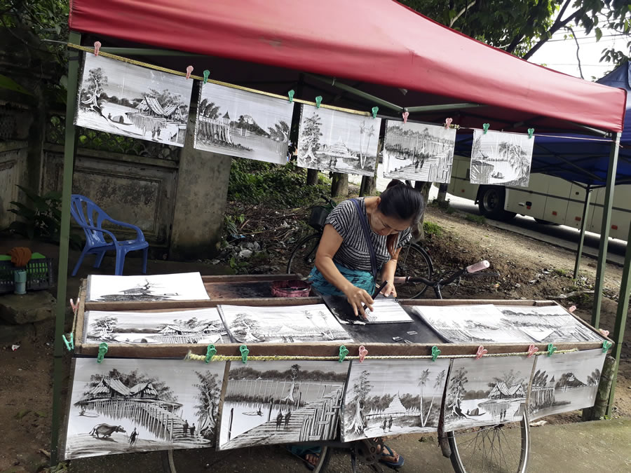 Đúng là Myanmar luôn có những điểm độc đáo thu hút du khách. Ngay tại cổng ra Công viên Mindhamma Hill, tôi gặp hình ảnh một phụ nữ Myanmar đang đứng vẽ tranh để bán. Giấy và tranh được bày trên một chiếc bàn gỗ cao ngang bụng người vẽ tranh. Nhưng tranh không phải vẽ bằng cọ thông thường mà người vẽ dùng búa có nhúng nhựa đường đập lên mặt giấy trắng để ra các hình màu đen, tiếp theo đó họ dùng con dao lam chỉnh sửa những nét búa đập xuống để ra được các hình ảnh tùy theo ý người vẽ. Những hình ảnh chùa tháp, đức phật, sông nước, chim cò… hiện ra mềm mại, sống động. Tôi say sưa ghi lại hình ảnh của người vẽ và không quên mua 1 bức hình Kyaiktiyo (Chùa Đá Vàng) với giá 5.000 Kyat (khoảng 85.000 đồng) về làm quà tặng con gái.