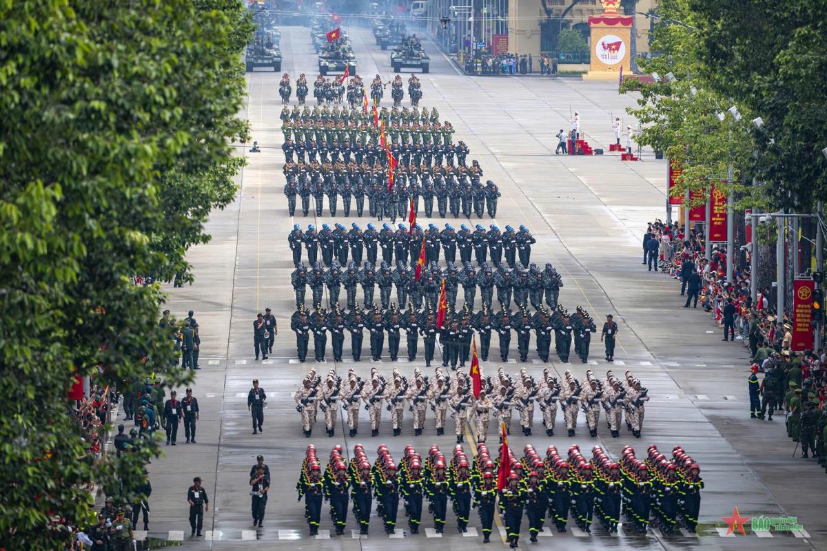 Tiếp theo là khối danh dự 3 quân chủng; khối nữ Quân nhạc; khối sĩ quan Lục quân; khối sĩ quan Hải quân; khối sĩ quan Phòng không - Không quân; khối sĩ quan Biên phòng; khối sĩ quan Cảnh sát biển Việt Nam; khối sĩ quan Hậu cần - Kỹ thuật, Công nghiệp quốc phòng; khối nữ sĩ quan Quân y; khối Học viên các nhà trường Quân đội; khối chiến sĩ Tác chiến điện tử; khối chiến sĩ Đặc nhiệm dù; khối lực lượng Tác chiến không gian mạng; khối nữ Gìn giữ hòa bình Việt Nam; khối chiến sĩ Tăng thiết giáp; khối chiến sĩ Pháo binh - Tên lửa; khối chiến sĩ Đặc công; khối nữ chiến sĩ Biệt động; khối chiến sĩ Công binh; khối nữ chiến sĩ Thông tin; khối chiến sĩ Phòng hóa. Các khối Dân quân, du kích gồm: Khối nam Dân quân tự vệ; khối nữ Dân quân các dân tộc Việt Nam; khối nữ Du kích miền Nam. Các khối diễu binh oai hùng hành tiến biểu tượng cho Quân đội nhân dân Việt Nam cách mạng, chính quy, tinh nhuệ, hiện đại, sẵn sàng chiến đấu, bảo vệ vững chắc độc lập, chủ quyền lãnh thổ của Tổ quốc.