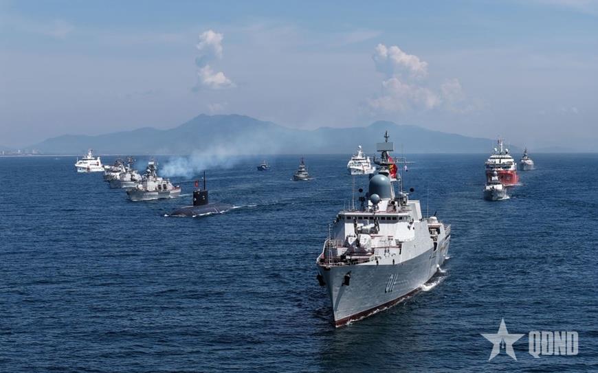 Lực lượng diễu binh trên biển đi theo đội chiến đấu hình chữ V với các tàu có khả năng trinh sát, hỏa lực mạnh; các tàu vận tải, tàu phục vụ và tàu chỉ huy được bố trí theo nguyên tắc tác chiến. Đội hình này giúp tăng khả năng quan sát, phát hiện mục tiêu; tiêu diệt các lực lượng địch, đồng thời sẵn sàng ứng phó kịp thời các nguy cơ tấn công của đối phương, không bị động, bất ngờ trong mọi tình huống.