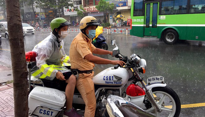 CSGT CATP Đà Nẵng nhường áo mưa, chở thí sinh đến điểm thi để kịp giờ. |