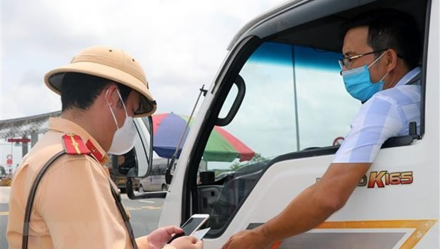 Cảnh sát giao thông kiểm tra giấy tờ của một phương tiện chở hàng hóa ngay tại chốt kiểm soát dịch COVID-19. |
