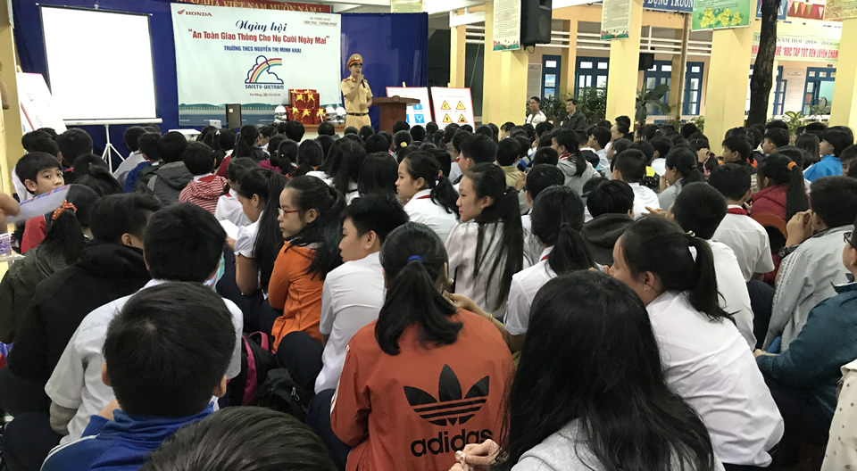 Ngày 26/11/2018 Head Honda Tiến Thu-Tường Phát đã tổ chức chương trình “An toàn giao thông cho nụ cười ngày mai” cho gần 500 học sinh Trường THCS Nguyễn Thị Minh Khai quận Thanh Khê, TP Đà Nẵng. Thiếu úy Đặng Xuân Thanh-Đội Cảnh sát Giao thông quận Thanh Khê phối hợp cùng đội hướng dẫn viên lái xe an toàn Head Honda Tiến Thu-Tường Phát đã trực tiếp tuyên truyền, huấn luyện và đào tạo kiến thức, kỹ năng lái xe an toàn cho các bạn trẻ. Bằng các phương pháp trực quan, sinh động kết hợp các trò chơi hỏi-đáp có phần thưởng, tạo được không khí sôi nổi, vui vẻ giúp các học viên dễ tiếp thu và ghi nhớ nội dung chương trình đào tạo. Chương trình này được Công ty Honda Việt Nam phối hợp với Bộ Giáo dục Đào tạo và Uỷ ban ATGT Quốc gia, Cục Cảnh sát giao thông-Bộ Công An triển khai sâu rộng trên cả nước. Là đại lý ủy nhiệm của Honda Việt Nam, trong nhiều năm qua, hệ thống Head Honda Tiến Thu-Tường Phát đã phối hợp với các đoàn thể, lực lượng CSGT duy trì và mở rộng các khóa đào tạo lái xe an toàn đến nhiều đối tượng, đặc biệt đối với lứa tuổi thanh niên trên địa bàn thành phố. Các bạn trẻ tham gia các lớp học này được nâng cao ý thức chấp hành pháp luật về giao thông, trải nghiệm thực tế, kỹ năng xử lý tình huống… đảm bảo an toàn cho bản thân và cộng đồng xã hội.