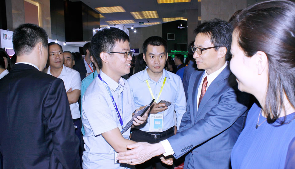 Nguyễn Minh Đức - CEO của Hekate đang giới thiệu Chatbot (AI) Hành chính công với Phó Thủ tướng Vũ Đức Đam tại Hội nghị Industry 4.0 Summit. |