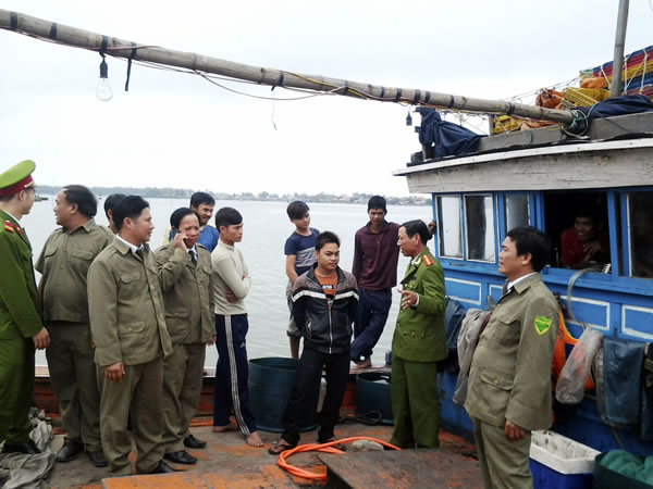 | Lực lượng Công an và Bảo vệ dân phòng TT Thuận An nhắc nhở tàu ngoại tỉnh trông coi tài sản cẩn thận. |