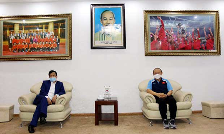 Trả lời Bộ trưởng, huấn luyện viên Park Hang-seo khẳng định quyết tâm giúp đội tuyển Việt Nam giành thành tích cao tại vòng loại World Cup 2022. Ông Park chia sẻ: "Năm 2021, bóng đá Việt Nam có nhiều nhiệm vụ quan trọng. Tôi hiểu đây là những thử thách. Tôi xin hứa sẽ cố gắng hết sức để cùng các đội tuyển Việt Nam hoàn thành những mục tiêu. Kết quả những trận đã qua là quá khứ. Chúng ta hãy cùng hướng tới những trận đấu sắp tới. Tôi đã dành thời gian vừa qua để nghiên cứu các vấn đề liên quan đến sự chuẩn bị 3 trận đấu vòng loại World Cup 2022 của tuyển Việt Nam. Hàng ngày tôi vẫn duy trì tập luyện để đảm bảo sức khỏe tốt nhất, nhằm chuẩn bị cho nhiệm vụ trong thời gian tới...", huấn luyện viên người Hàn Quốc chia sẻ.
