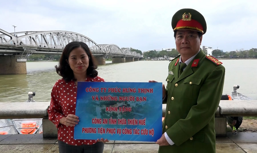 TT-HUẾ-Ngày 3-12, CA tỉnh tổ chức đón nhận 11 thuyền, trị giá 300 triệu đồng do Cty Phúc Hưng Thịnh hỗ trợ để phục vụ công tác phòng chống thiên tai và cứu nạn cứu hộ. Đón nhận sự hỗ trợ từ Cty Phúc Hưng Thịnh, Đại tá Hoàng Văn Thành - Phó Giám đốc CA tỉnh TT-Huế cảm ơn tình cảm, sự chia sẻ của nhà tài trợ. Đây là loại phương tiện hết sức quan trọng để vận chuyển, di dời người và tài sản cho nhân dân trong lúc lũ lụt, nhất là ở những địa bàn thấp trũng. Sau khi tiếp nhận các thuyền này, CA tỉnh sẽ giao cho CA các huyện: Phong Điền, Quảng Điền, Phú Vang và một số phường địa bàn thấp trũng TP Huế quản lý, sử dụng. Dịp này, Cty cũng hỗ trợ hạt giống và phân bón cho H. Quảng Điền (TT-Huế) trị giá 230 triệu đồng. Đồng thời, trong đợt thiên tai này, Cty cũng trao 3.000 phần quà, trị giá hơn 1 tỷ đồng cho người dân ở các vùng lũ: Quảng Điền, Phú Vang và Phong Điền (TT-Huế).