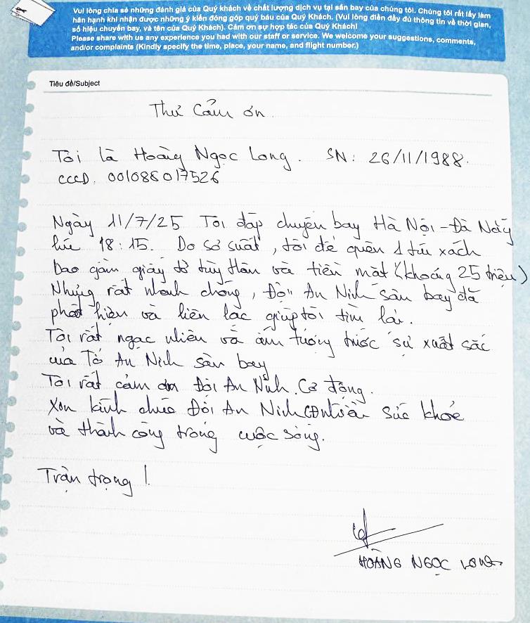 Ngay sau khi nhận lại tài sản, hành khách đều bày tỏ sự xúc động và gửi lời cảm ơn chân thành đến Đội An ninh cơ động nói riêng, Trung tâm An ninh hành không Đà Nẵng nói chung. Chị Đào Thị Bích Hằng chia sẻ qua email: “Các anh quá nhiệt tình và làm việc quá tốt giúp tôi tìm lại túi xách nhanh chóng mặc dầu tôi nghĩ sẽ không tìm ra, một lần nữa xin cảm ơn các anh”. Còn anh Hoàng Ngọc Long thì viết thư tay: “Tôi rất ngạc nhiên và ấn tượng trước sự xuất sắc của Tổ An ninh cơ động Sân bay Quốc tế Đà Nẵng. Tôi rất cám ơn Đội An ninh cơ động. Xin kính chúc Đội An ninh cơ động nhiều sức khoẻ và thành công trong cuộc sống”.